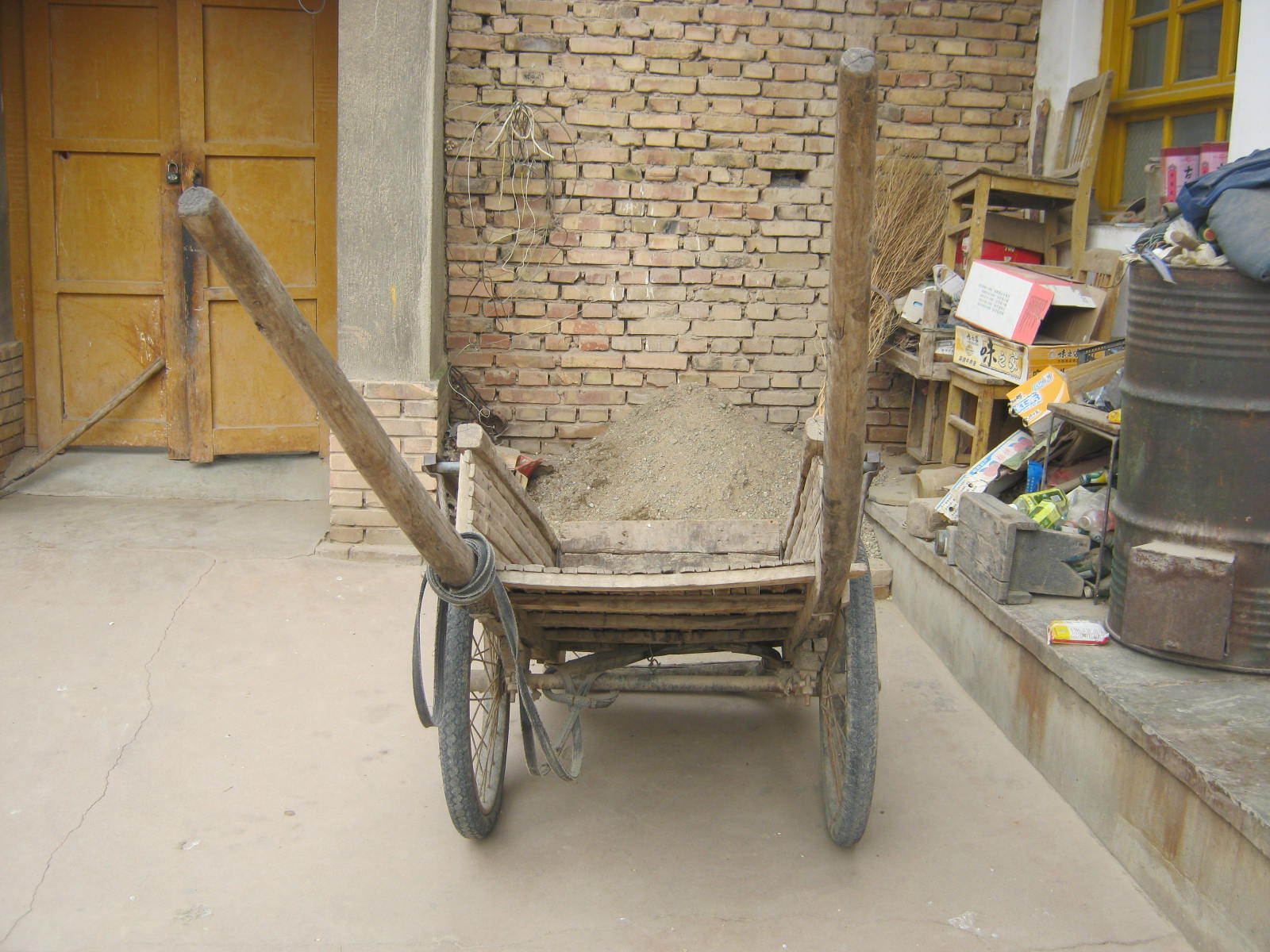 架子车这种农具只有在我们农村有,在十年以前架子车是当地农民主要的运输工具,每家每户基本上都有这样的一个架子车,不论是往地里面运肥料还是拉麦子都用它。