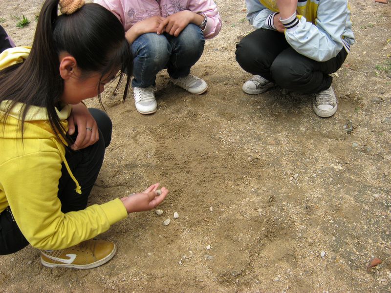 游戏是在两个人之间进行的。先在地上撒一层薄薄的细土,把几颗子子撒放其上,先把其中一颗抛起,再用手背接住,再抛起。这是最基本的。在子子在空中飞舞的瞬间,还要再次从地上抓起指定的几颗子子。高手可以同时控制7、8、10来颗,还可以先后把子子抛起,在逐一接住,就像杂技演员的表演,只看的人眼花缭乱,佩服不已。