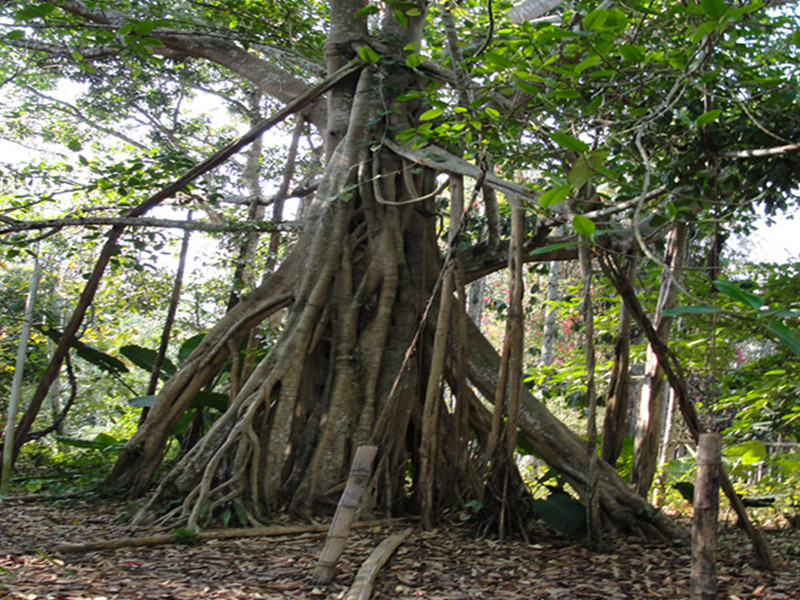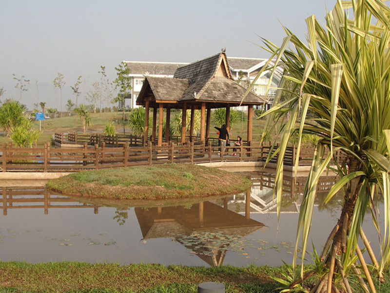 太阳已经从地平线上绽开笑脸,把我们面前这几座被芭蕉树、椰子树包围的傣族木屋映得金灿灿的。木屋有的三层高,但多数都为二层,一楼一般圈养牲口,二楼住人。这木制的小楼看上去真有古老气息,每天听着流水声,树叶声,鸟叫声,看着外面的绿树繁花走进去别提的多惬意了。