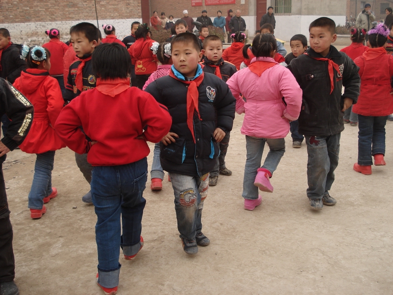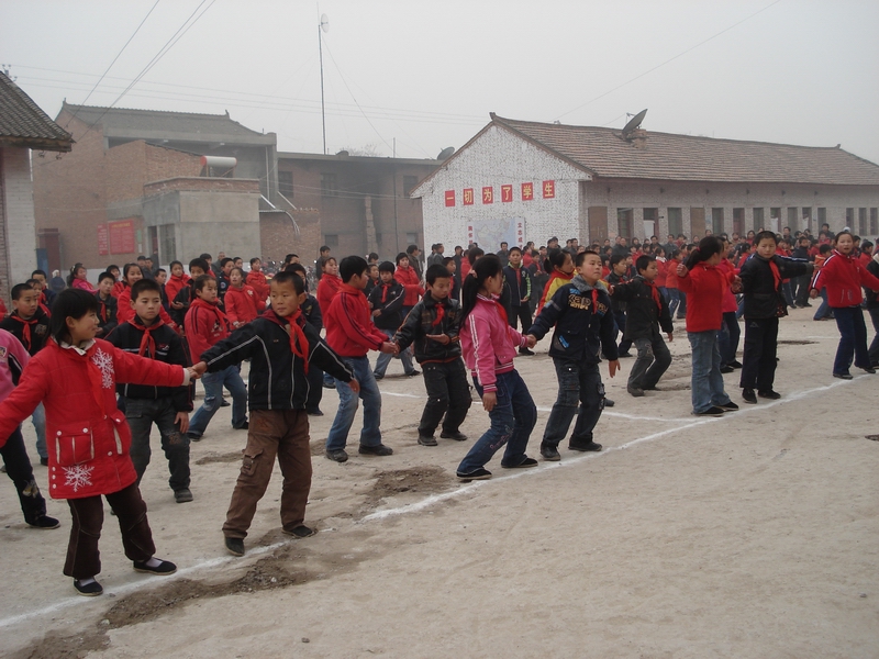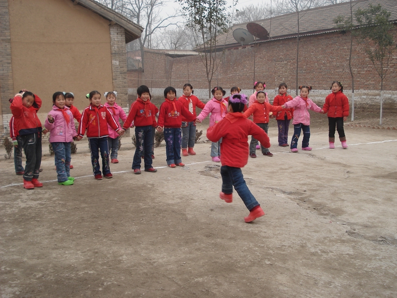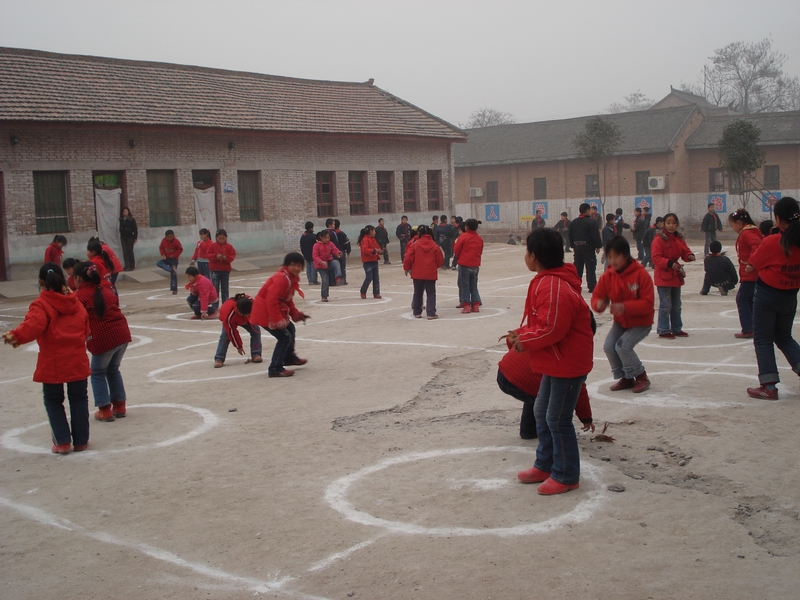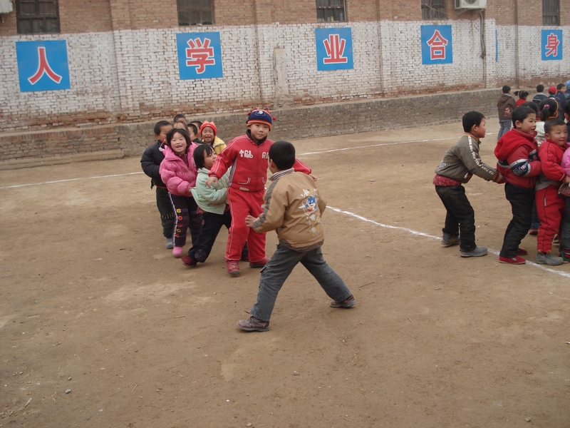 三年级同学正在玩游戏——跑马城。学生们分成两组,手拉着手,互相对喊着歌谣:“格格城、跑马城、马城开、叫谁来?叫你某某碰城来。”被叫到的学生就快速地跑过去碰对方的防线,碰开的话就算赢,带一个同学回归本队;碰不开的话就加入对方。当然,经常被点名的同学往往是身单力薄者。