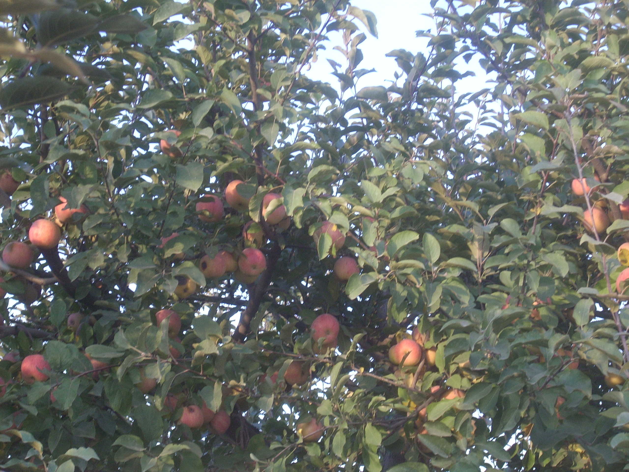 果园里,苹果树上结满了又大又红的红苹果,像一个个大红灯笼照亮了果园。这么多的水果颜当然也不同了,有红的,黄的,绿的,紫的,不同颜色的,味口也很好,有的脆,有的甜,有的酸等等。