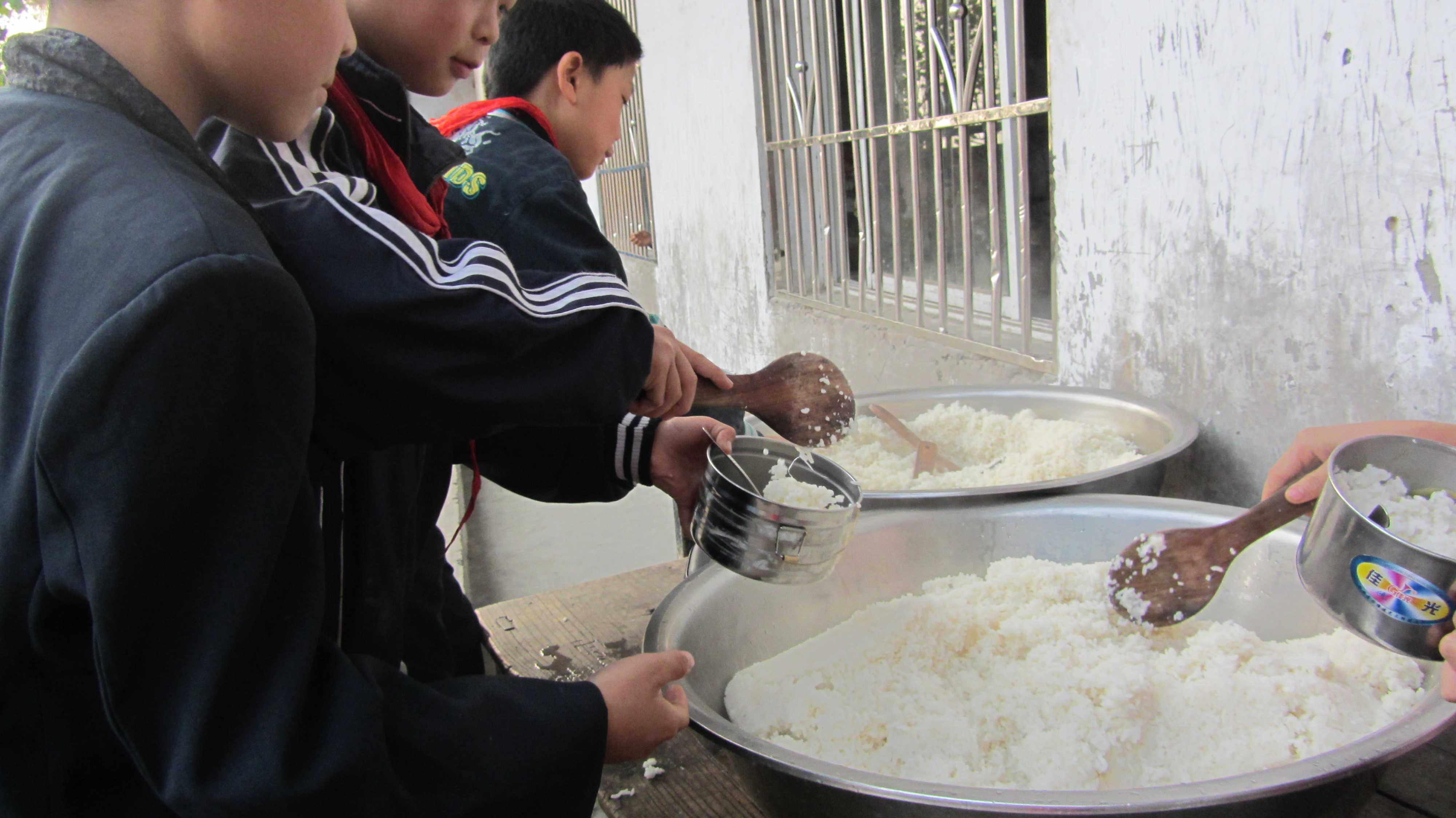 两盆白花花、香喷喷的大米饭正冒着热气,同学们虽然已经饿得前胸贴后背,还是井然有序的排队打饭,当然了,大家都很小心,不让米饭撒到地上,我们大多数的父母都外出打工,家里就是爷爷奶奶在干活,收割谷子的时候我们也去帮忙了,体会到“谁知盘中餐,粒粒皆辛苦”的真实含义。
