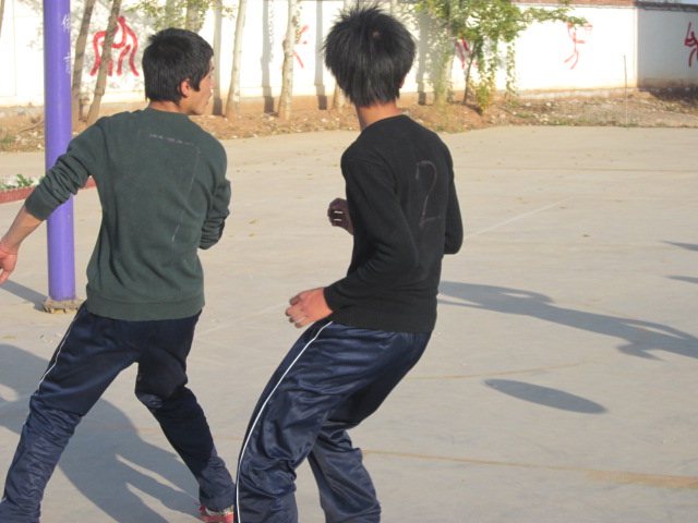 在下半场中,对方一直领先我队两个球,我们的球员们奋力拼搏着想把比分反超。但对方一直占据着优势,总也抢不到球。就在这时,对方的一名队员松懈了,我班球员趁这一时机,飞一般的抢到了球,可是用力过猛,他的右腿抽筋了,比赛暂停。
