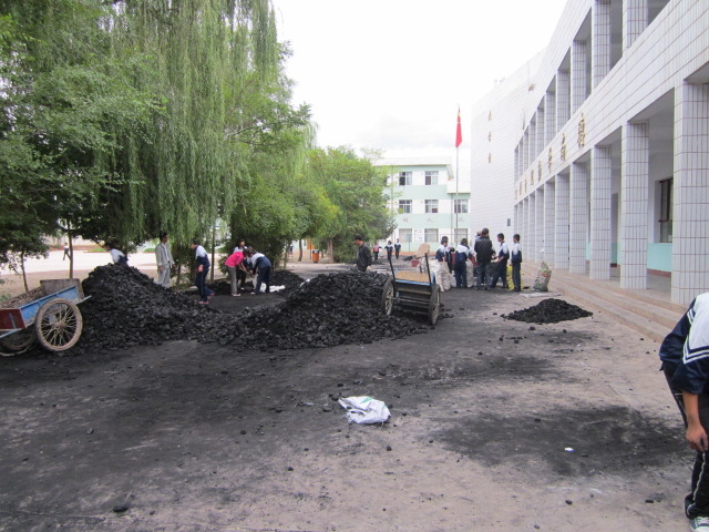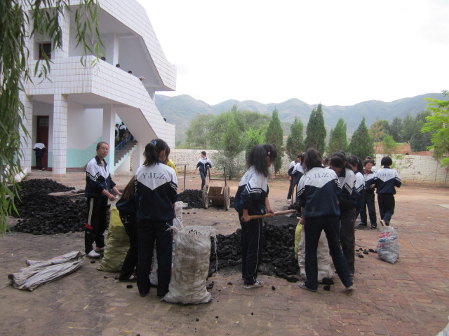 我们先把堆成小山一样的炭堆分成一个个数量相当的小堆,然后各班把自己的用纤维袋子装起来,放在二楼的炭房。