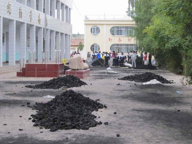 那天,一辆大卡车拉来了像小山一样高的炭堆在了我们教室门口。 下午的最后两节课上,老师组织每个班的同学都出来干活。我们好高兴啊,因为又可以不用上课了。
