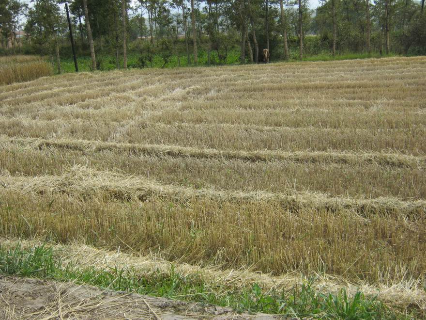 这一片地种的是麦子,麦子成熟的要比菜籽早一些,所以已经收割完了,现在收割庄稼比以前轻松了很多,很多人家都雇佣收割机来收庄稼了,这样就省了劳力,家里的人就可以出去打工挣钱了,收割完的麦地只留下了短短的麦茬。
