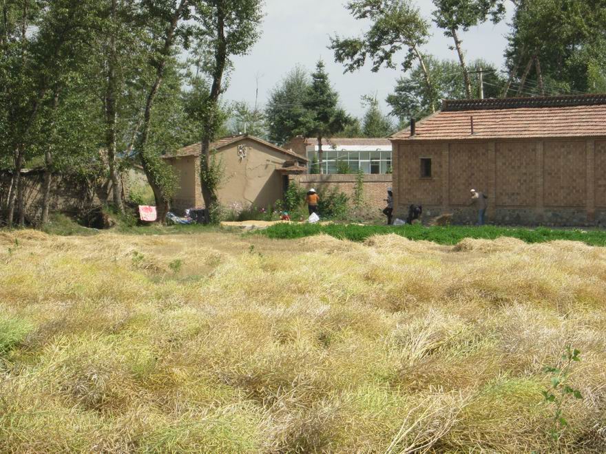 这是一片油菜地,菜籽已经拔下来了,要把这些菜籽放到地里晒几天,晒到菜籽全部干透才行,只要轻轻的捶打,菜籽就从里面跑了出来,不过大家都是用手扶拖拉机碾菜籽,对面的人家正在晒粮食,一家人正忙得热火朝天。
