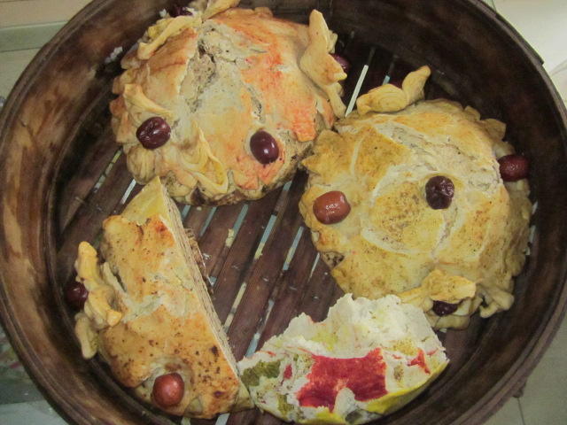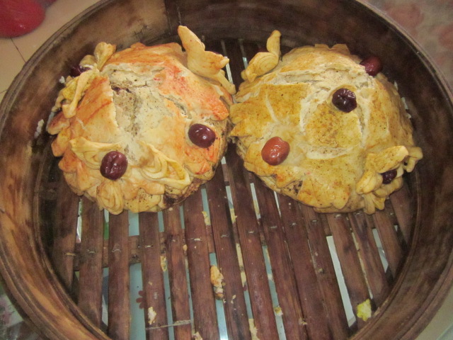 再者,我们的月饼也没有馅儿,它是由一层层的薄面饼堆成,最上面一层再放上红枣、瓜子、核桃等,做好了就放在蒸笼里蒸。大概蒸半个小时就好了,可是这半个小时对我来说真是漫长呀,真像过了半年那么久。