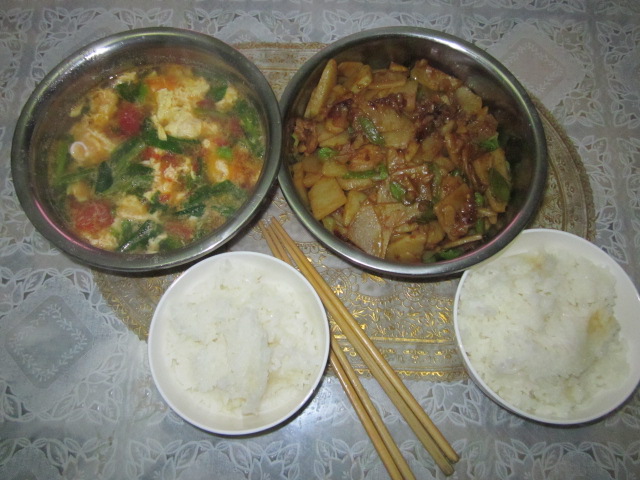 整整做了一个多小时,经历了油溅到脸上,菜刀切到手的手忙脚乱之后,我终于把我的杰作端上了桌子。虽然土豆片炒的有点焦,西红柿鸡蛋汤做的有点咸,再没有其它缺点了。