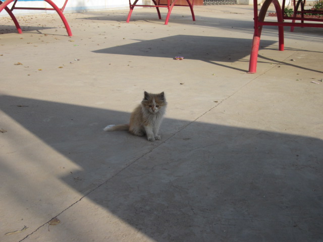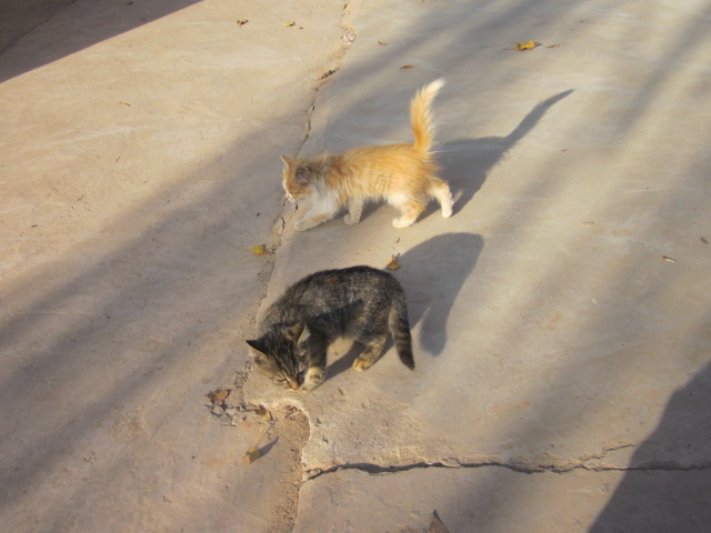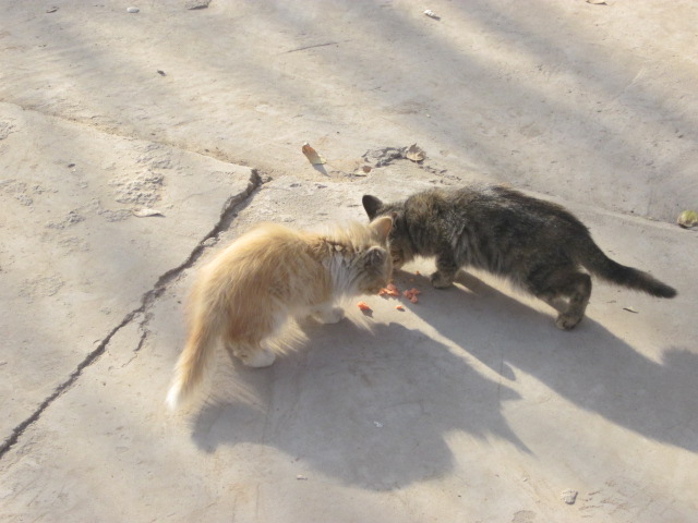 这两只可怜的小猫,把我们的学校当做自己的家。真希望能有更多的同学去照顾他们,给它们一点吃的,不要去欺负它们。