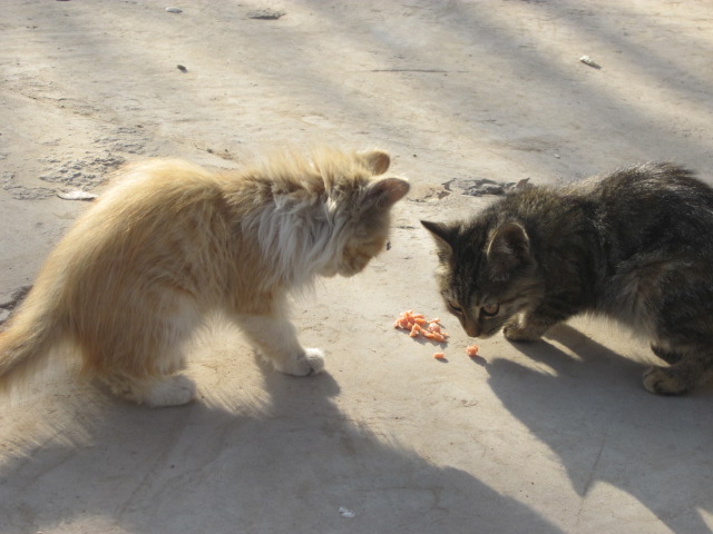 国庆放了一周假,回到学校才想起它们。我赶紧买了两三根火腿肠给它们,刚撕开,他们就嗅到了那熟悉的味道,一路跟着我。我把火腿肠掰成一块一块放到地上,奇怪的是,刚放下就围过来吃。当我伸手去喂时,它们也没躲开。我想小猫一定饿坏了。