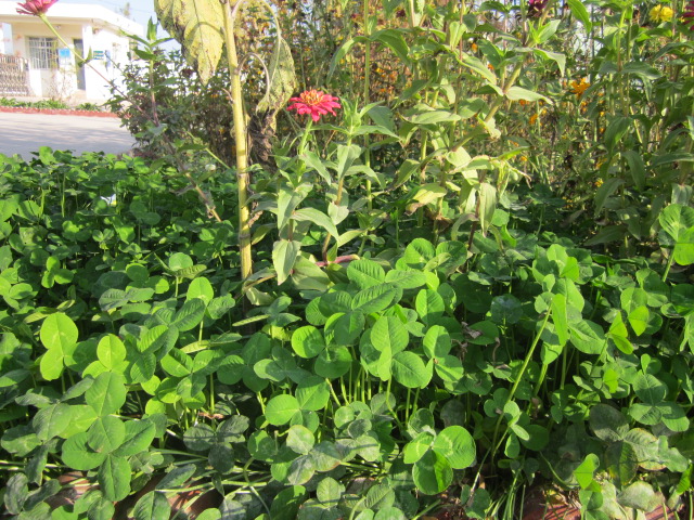 黄色和红色的都是花,黄色的花分成了很多花瓣,但是它们都紧紧的围在了一起,象征着团结一致的学生。红色的花不知名叫什么,它们是条状排列很整齐。绿色的则是绿树和三叶草还有糖萝卜,高高绿绿的,分布在花园的两侧,像是那守护花园的神。