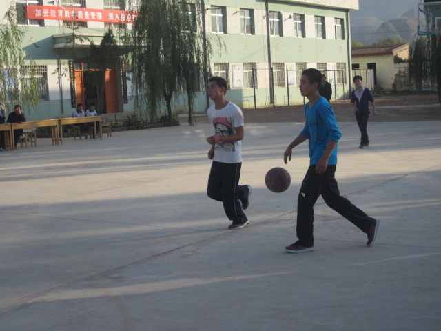 在篮球运动场上运动员员准备就绪,只听裁判员哨声一响,便各自开始抢球。蓝球就像一只飞来飞去的蝴蝶,一会儿跑到这儿,一会儿又跑到那儿。只见传球人把球传给后卫,一个转身接着投篮,篮球就"嗖"的一下进到了篮环中。旁边加油喝彩的同学使劲鼓掌,为运动员们喝彩。