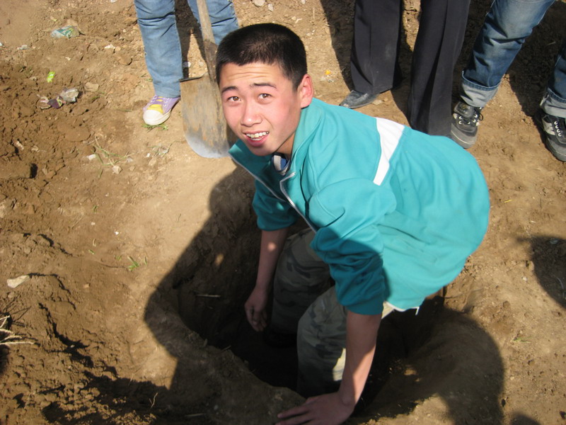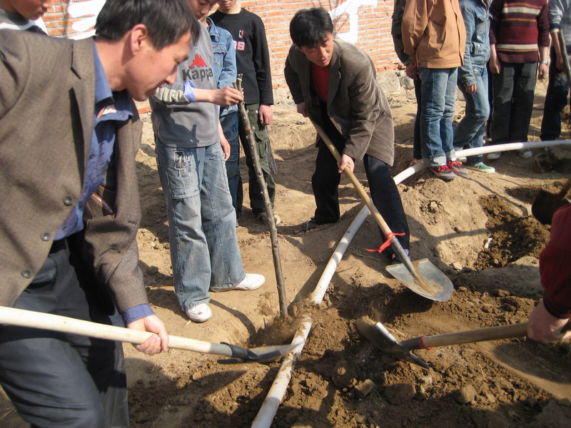 我们在老师的带领下开使在指定地点开使挖树坑了。因为要挖深一点方一点的树坑所以用铁锹不铲土,只 能用手往出挖,而铁锹不时的发出吱吱声好向在说,慢点不要把我给折断了。