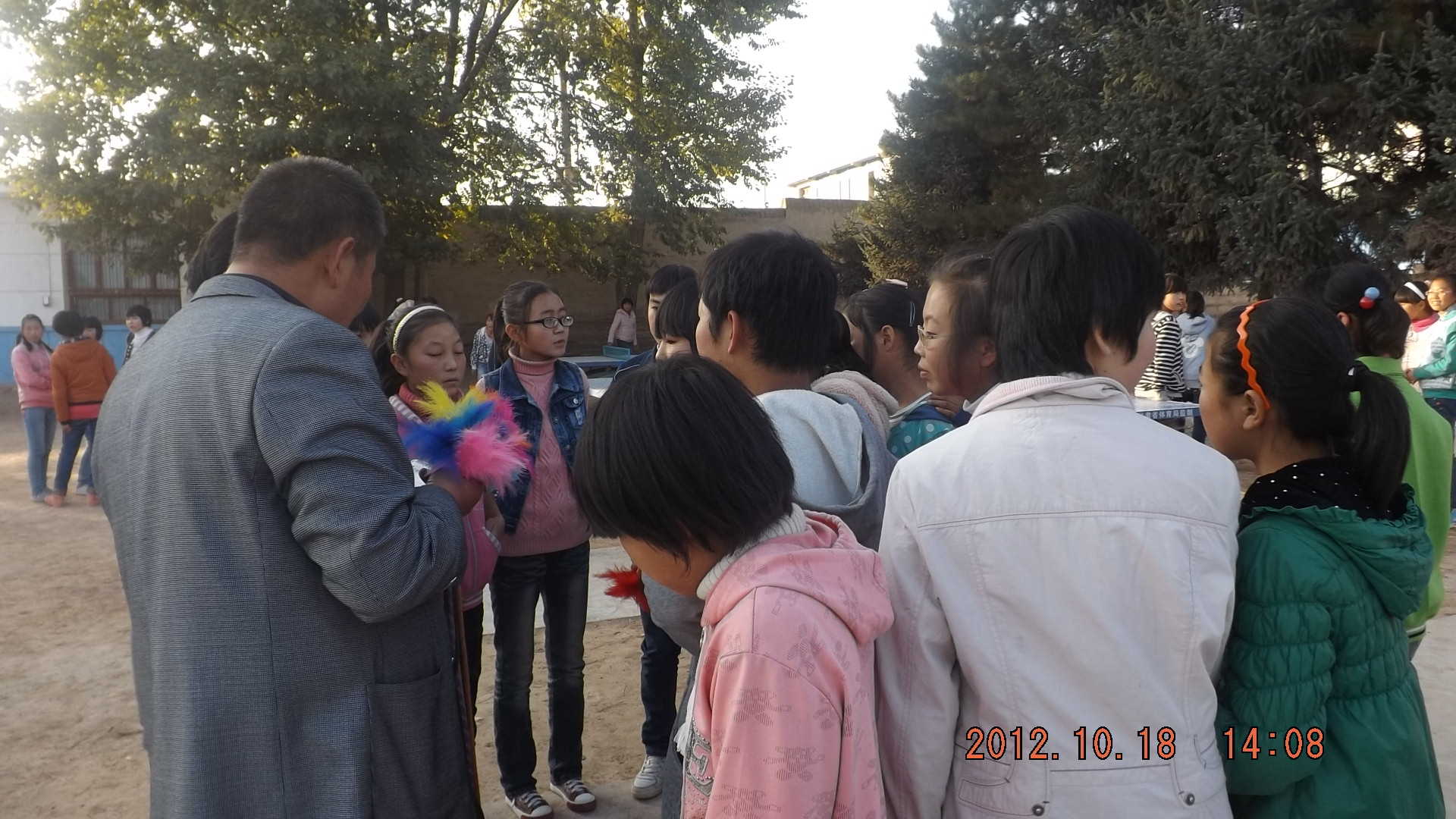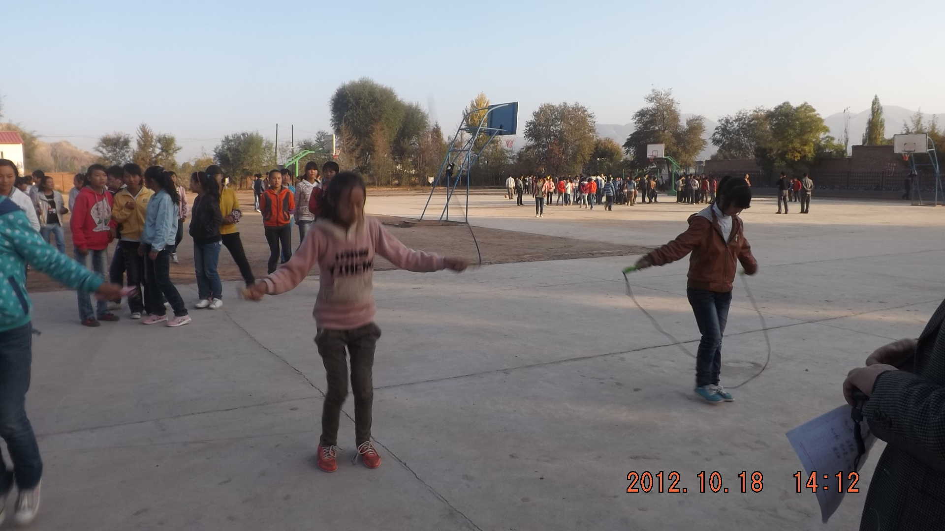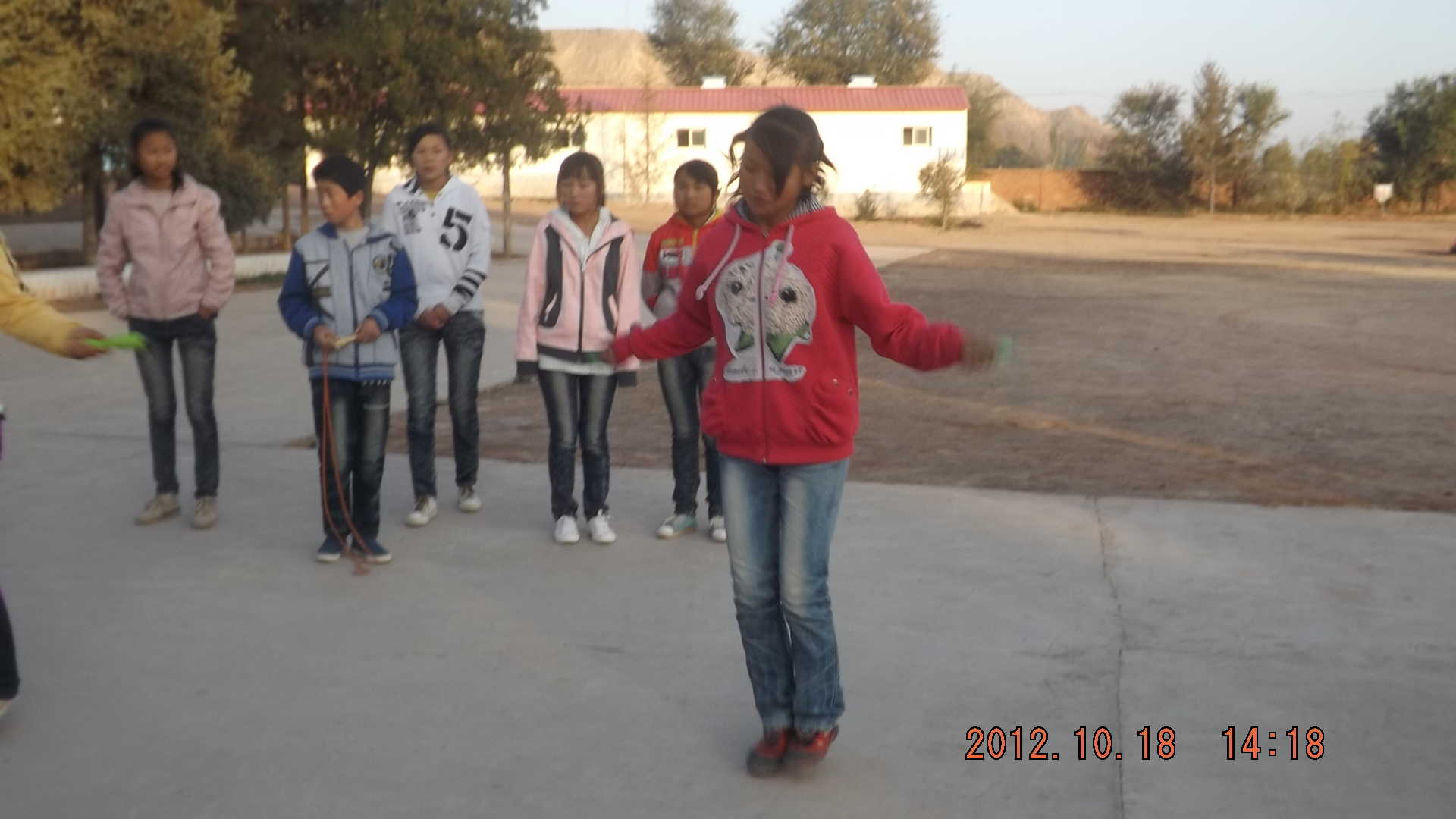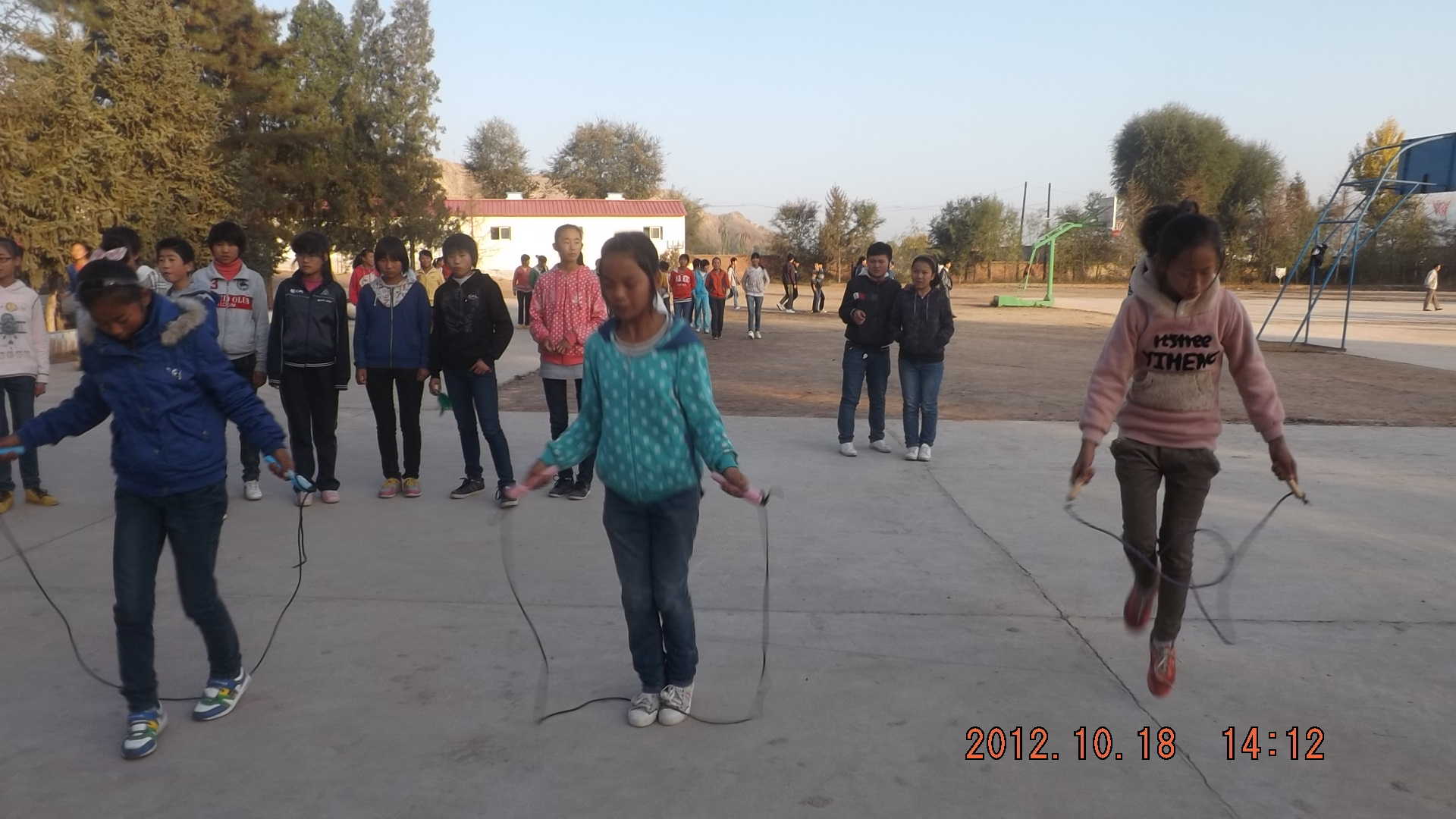 我们女同学平时的运动项目就是跳绳,以前的时候我们跳绳的时候都是自己从家里拿来的跳绳,这种跳绳是我们自己做的,用橡皮连起来的,分成两组,一组负责甩,一组跳,后面还有追赶的同学呢!