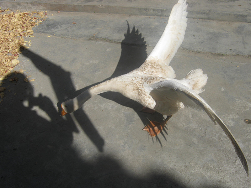 大白鹅整理好自己的卫生后又伸长脖子“嘎嘎”地欢快的叫着。我用小木棍逗它,它调皮的张开两只大翅膀高声的“嘎嘎”地叫着,我想把它赶进后院里,它就是不进去,我费了很大的劲才把它赶到后院里。