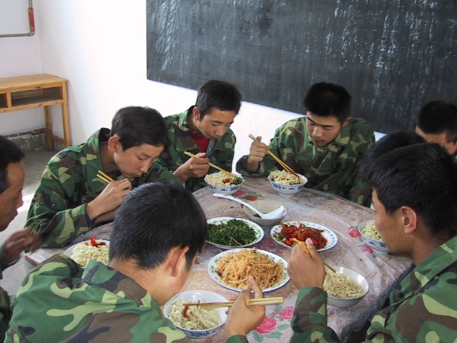 还没有休息多长时间呢,结果,在教官的一声令下之后,大家又从原地起立,继续站军姿,虽然很难受,但是没有办法,就这么坚持着,毕竟稍稍休息了一下,比起前面快要坚持不住的那会儿还是好受多了,时间依然在流逝着,就在我的坚持中慢慢流逝着,大概过了半个小时吧,终于,又可以休息一会儿了.......就这样,时间慢慢往前蹒跚,我们也在坚持和休息中更替着......终于到了晚餐时间,大家都很饿,可是,似乎教官们还不紧不慢,首先是全体集合,然后依次进入食堂,在坐好后还不让立刻就餐,先要唱首军歌,然后才能开饭,无奈,在唱完军歌后终于开饭了,大家开始津津有味地吃了起来......