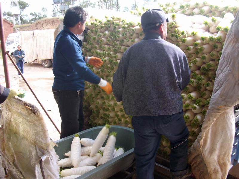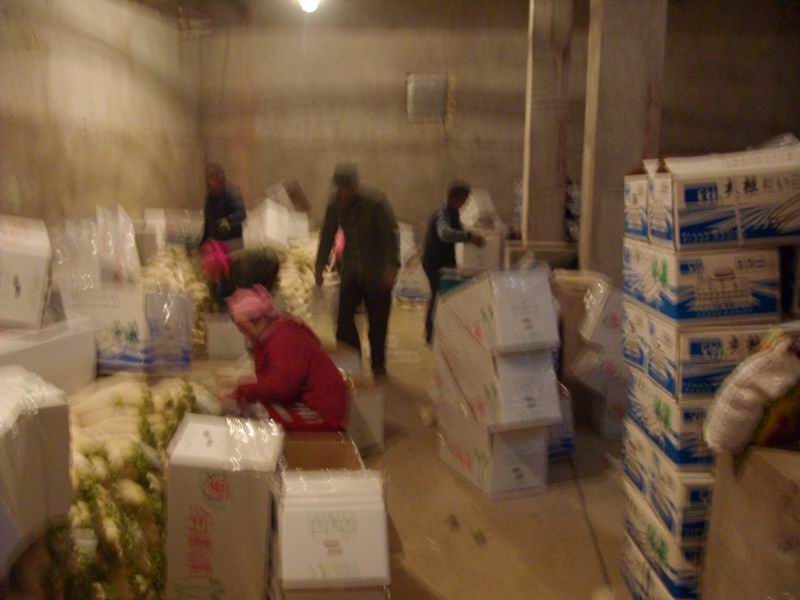 繁忙的农运车,它们循环地在地里和冷库间穿梭,任务是把地里洗好的大萝卜运回冷库,保证每天一库的任务。运来萝卜后,“先行队”把一根根雪白的萝卜卸下车,用小盆车送到冷库里,一排排地摆好。有冷空气为它们服务,这样萝卜们可舒舒服服地休息休息身体。第二班打包工做好纸箱后,开始在冷库里给白白净净的萝卜打包,他们耐着寒冷,一根一根地过手,精心挑选,把苗条漂亮的萝卜装在同一个箱子,萝卜们开心极了;超高、肥胖症者安排在一起,只能同病相怜了。经过挑捡、装箱、过称、打包几个步骤,各种型号规格不同的萝卜箱整齐地摆放各自的位置。包打好后,就等上车了。