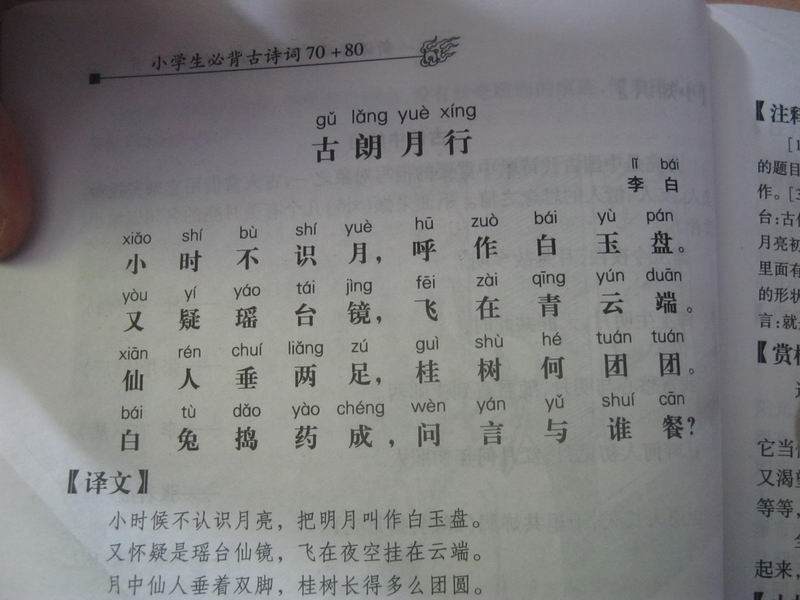 还有"诗仙"李白的《古朗月行》"小时不识月,呼作白玉盘",借助丰富的想象力和神化传说,表现了诗人在儿时对月亮的喜爱之情,仿佛让我看到了一个儿童的天真烂漫......
