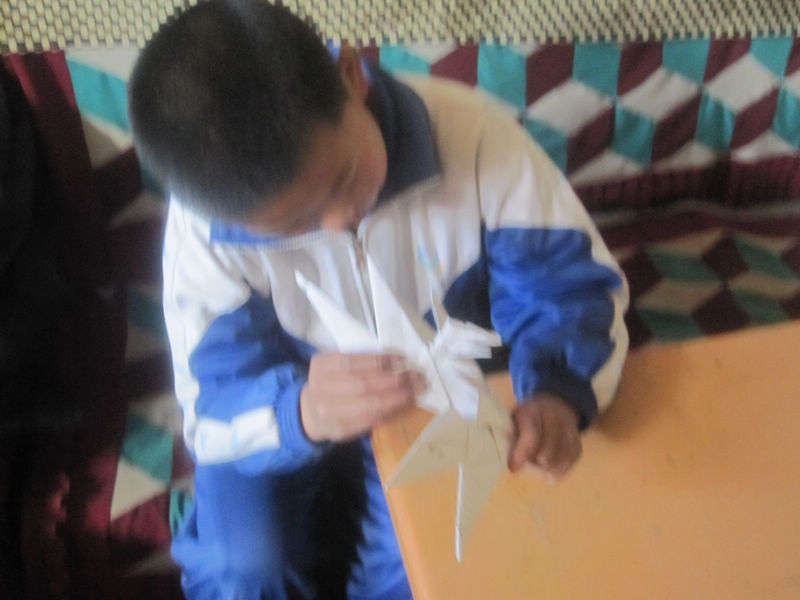 他平常爱动手自己制作玩具,这不他又用五张白纸叠了五个三角形,又互相套在一起,做成了一架完美的飞机,他还用纸叠了一个飞镖,每当完成时,他就会感到无比的自豪。脸上洋溢着成功的喜悦。