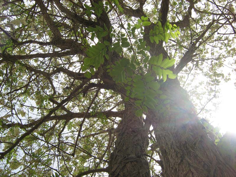 你认识这种树吗?它就是槐树。 每年的四月末,它就会长出嫩绿的新芽。而在这时,其他的树木已经是枝繁叶茂了。它还有一个与众不同的地方就是全身上下都长满了刺,这也许是为了更好的适应西北的生长环境吧!
