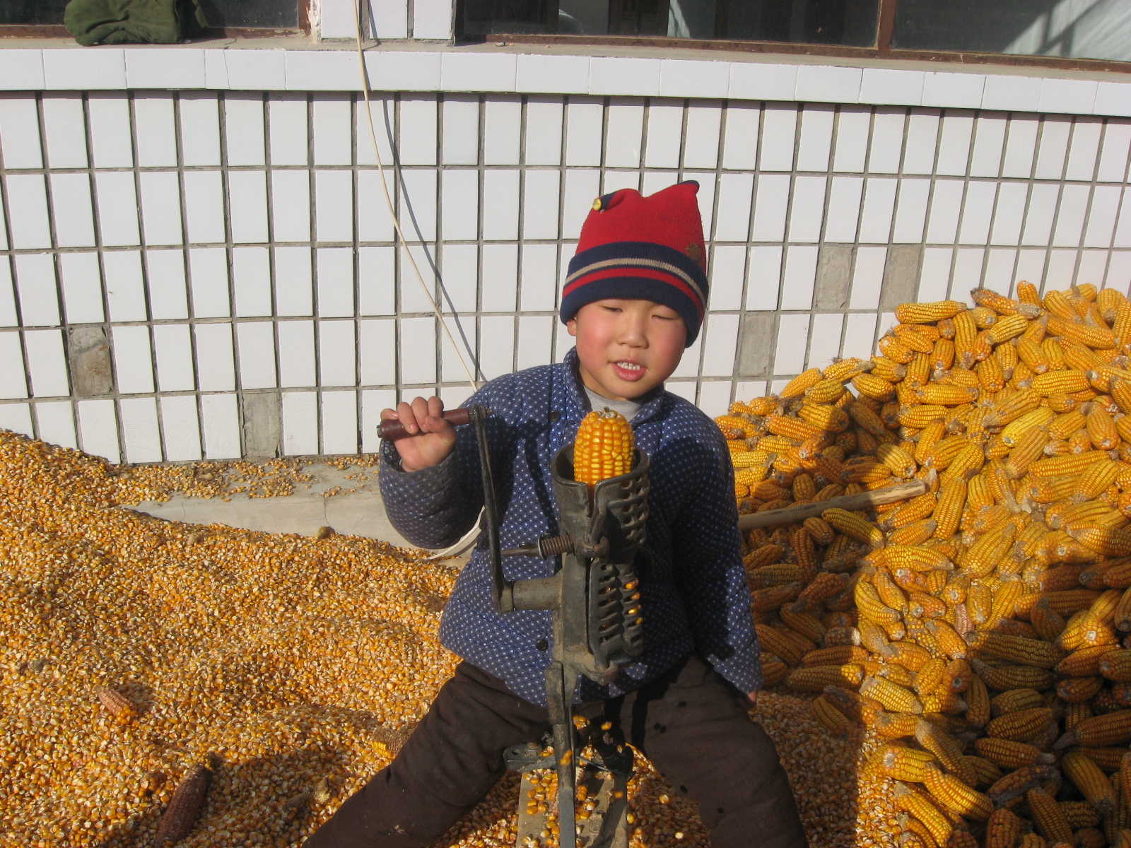 过了一会儿,我们干得有点累了。回到屋里歇息唱点水。而这个小家伙,也抓了一根玉米,放进脱粒机里。然后用手使劲的转动,几秒钟过后,一根玉米就脱完了。接着再拿一根放进去,做得有模有样。
