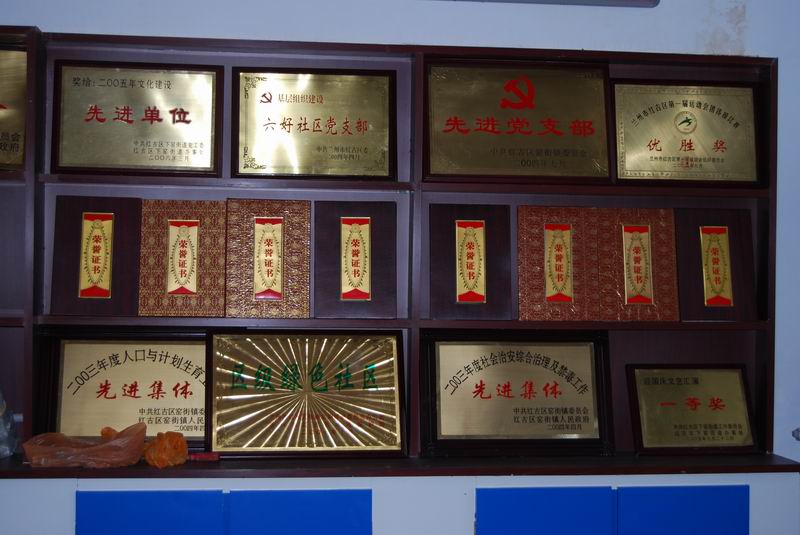 另一间办公室里,我看到了满满的一墙奖状,先进单位,先进集体,绿色社区等等的荣誉都在墙上静静陈列。我们这的社区是一间优秀的社区,每年市里省里的评比都会获奖,而这也正是取决于社区工作人员辛勤的劳动和无私的付出。