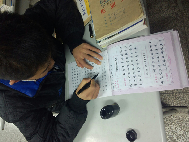 我认真的练习着字帖,旁边的同学们都夸我:“写的不错啊”!