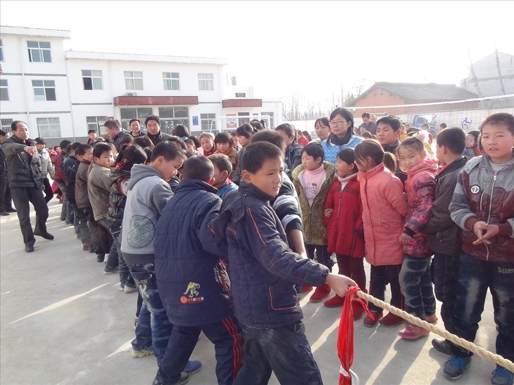 今天下午,天空万里无云。在这晴朗的日子里,我们学校进行了一至六年级的拔河比赛。
