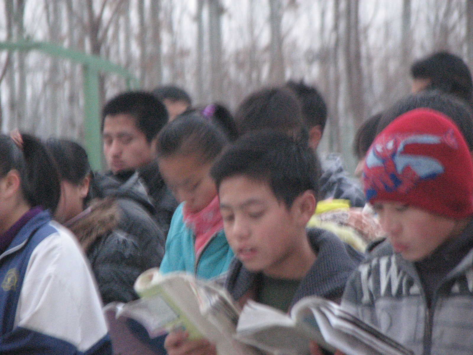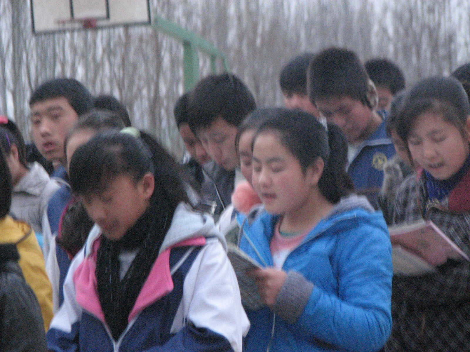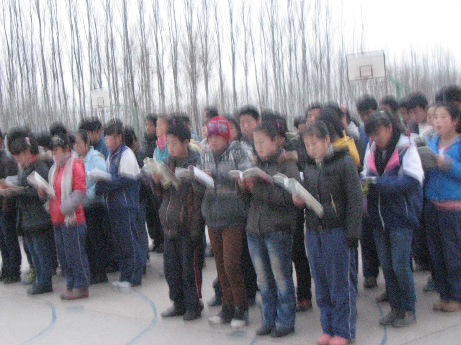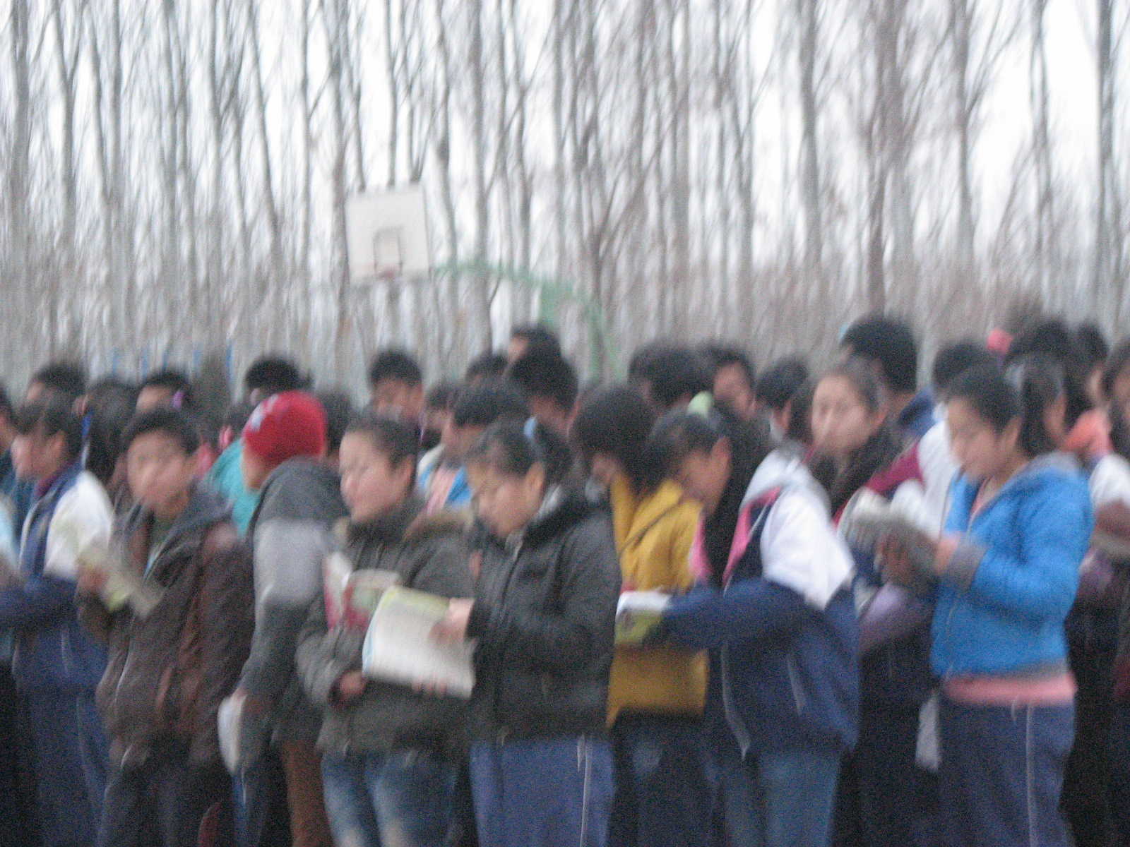 教室里,走廊上,高高的篮球架下,五六个,两三个,还有独自一个的。他们有的捧着书本,认真朗读;有的把书本放到身后,抬起头背诵着,一会儿,又拿起书看了一眼,继续背下去。