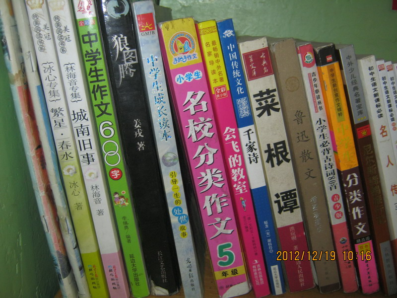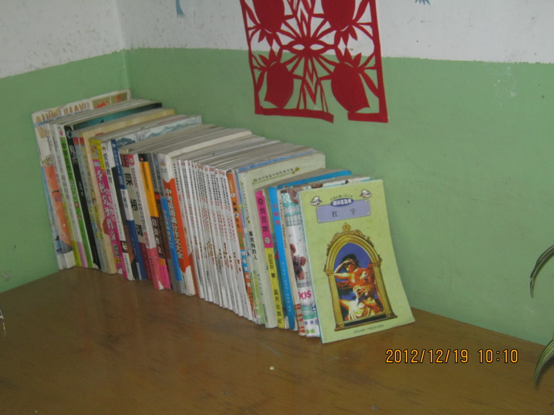 同学们为班级图书角积极捐书,有些同学把自己心爱的书也都毫不犹豫地捐献了出来。所以,我们班的图书角里有各种各样的书,有作文类的,有神话类的,有文学类的,还有科学类的。如:《奇剑双妹》、《希腊神话》、《狼图腾》、《冰心专集》、《千家诗》、《百科全书》、《菜根潭》……真是应有尽有啊!