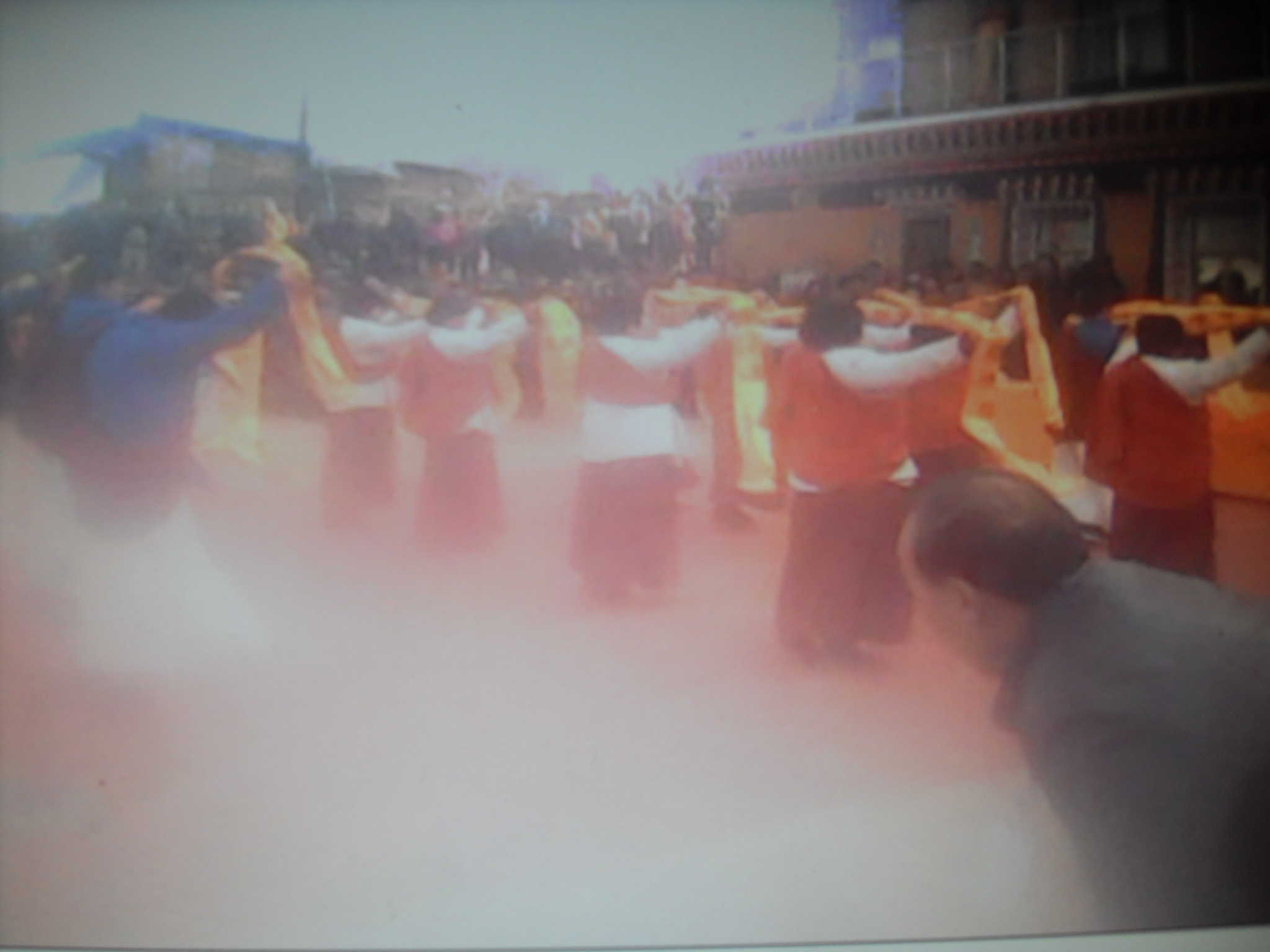 周六早上我起的很早,急忙收拾完,便去了大寺。刚走出家门几步,到了十字路口,就听见鞭炮雷鸣。接着往前走,只见人来人往,还出现了一派崭新的面貌—在路旁都摆上了小摊,甚至在必经的地里,也有大车拉来卖床单的。一路走过,四处张望,就犹如走在了张家寺繁华的大街上,有卖衣服的,卖橘子的,卖烧烤的,当然,卖黄纸,卖香炉的更是少不了了。接着,便到了寺院内,刚进院,印入眼帘的,不是寺院建筑,也不是大佛,而是密密麻麻的人群。由于我去的迟,没看上跳鼓,我就先退了出来到了护渠那里,那一道道白色的护栏是由一个个小白塔连接而成的,左右两边又有一个大一点儿的白塔,寺跟前,在用小石块砌成的莲花瓣中央坐着一个大佛。